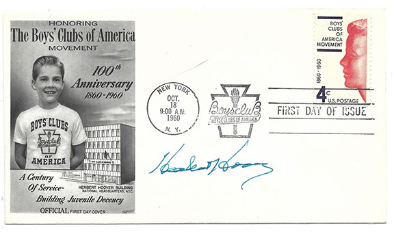 HOOVER, Herbert (1874-1964) 31st President of the United States (1929-1933). He held office during the onset of the Great Depression. His term was noticeably marred by the Stock Market crash of 1929. First Day of Issue of the Boys Clubs of America 4 cent U.S. postage stamp. Nice cachet honoring the movement. Hoover was honorary chairman of the movement. Stamp cancelled First Day of Issue. Circular postal cancellation New York Oct.18, 1960 N.Y. Signed by Hoover with his usual green ink. Lately, First Day Covers signed by Hoover are seldom offered. Fine condition................$250.00