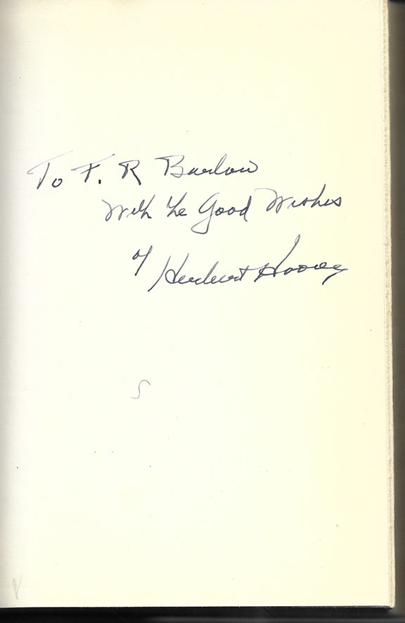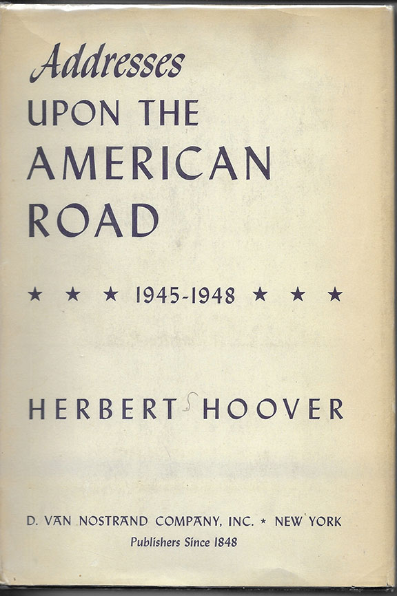 HOOVER, Herbert (1874-1964). Thirty-first President of the United States. Addresses Upon The American Road 1945-1948. D. Van Nostrand Company, Inc. 1949, First Edition. Three hundred-nineteen pages. Inscribed and signed on the front free endpaper: “To F.R. Barlow with the Good wishes of Herbert Hoover.” Ex-library copy from Free Public Library of Summit, New Jersey. Usual library stamp/markings and card holder inside last page otherwise a V/G copy with the uncommon dust jacket...........$275.00