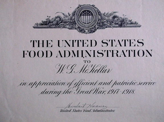 HOOVER, Herbert (1874-1964). 32nd president of the United States (1929-1933). He was appointed by President Wilson the U.S. Food administrator on may 19, 1917. Very attractive partly printed document signed circa 1918-1919. Large engraved vignette across the top on assorted fruits and vegetables. The U.S. Food administrator to W.G. McKeller in appreciation of efficient and patriotic service during The Great War (1917-1918). Signed by Herbert Hoover. Ideal for exhibition. Hoover is very scarce in signed documents and this is a very early full signature of Hoover................................ $450.00