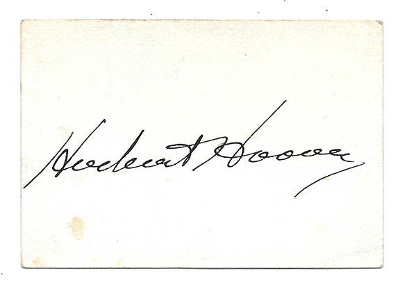 HOOVER, Herbert (1874-1964). Thirty first President of the United States. Perfect dark bold signature on a slip of card stock.................SOLD