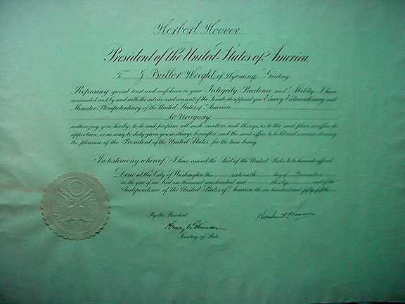HOOVER, Herbert (1874-1964). 31st President of the United States. He became President 8 months before the stock market crash of Oct. 1929 and the Great Depression which started in 1930. Document signed, folio, Washington, December 16, 1930, measures 18”x22”. Appointment of J. Butler Wright to the Office of Envoy Extraordinary and Minister Plenipotentiary to Uruguay. Fine clean signature of Hoover as President and countersigned by Henry L. Stimson as Secretary of War. Large wafer seal affixed to the bottom left of the document. Up through President Kennedy, Hoover is the scarcest in signed Presidential documents. Many collectors settle for a Hoover document with a printed signature. More JFK signed documents have appeared on the market in the last several years than those signed by Hoover. More Hoover A.L.S.’s have appeared on the market then signed Hoover documents and Hoover A.L.S.’s are considered scarce. In fine condition and rather scarce.................$750.00