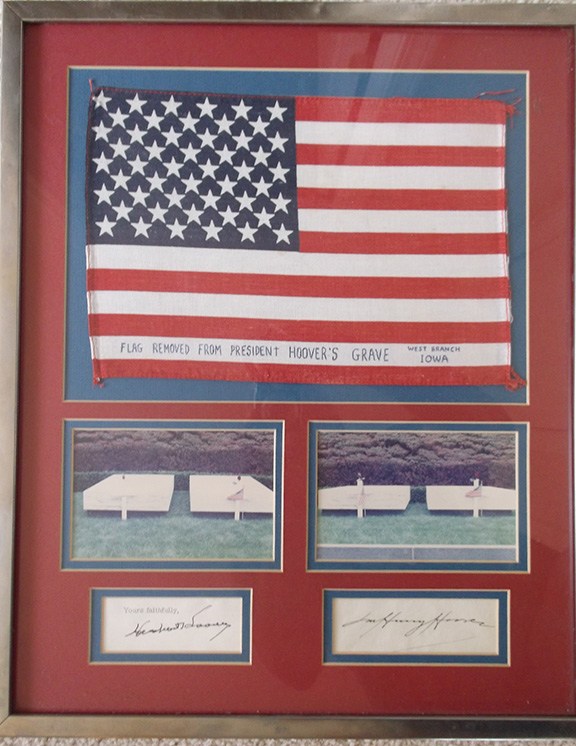 HOOVER, Herbert (1874-1964). Thirty-first President of the United States. HOOVER, Lou Henry (1874-1944). First Lady (1929-1933). Signatures of Herbert Hoover and Lou Henry Hoover, double matted along with two photographs of their graves. One photograph illustrates their graves in West Branch, Iowa with an American flag flying at the base of each grave stone. The other photograph shows the flag from Herbert Hoover’s grave removed. Included in this frame ensemble is the original flag that was removed from Herbert Hoover’s grave. These flags are removed on a regular basis as they become worn. The double matting used is red and blue. A very patriotic and most unusual display.......$250.00 ![]() |