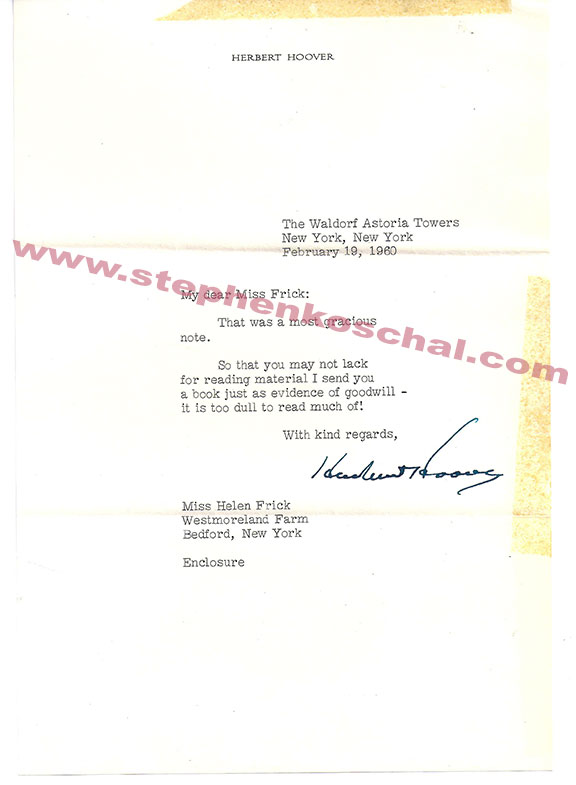 HOOVER, Herbert (1874-1964). 31st President of the United States. Very interesting content (unusual for Hoover) typed letter signed, one page on his name imprinted letterhead. The Waldorf Astoria Towers, New York , February 19, 1960. Hoover writes: “That was a most gracious note. So that you may not lack for reading material I send you a book just as evidence of goodwill - it is too dull to read much of!” Very boldly signed. Tape residue on portion of top and right margin easily can be matted out. The book Hoover sent was one of his own An American Epic..........................$225.00