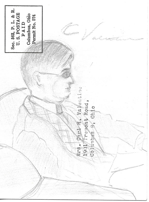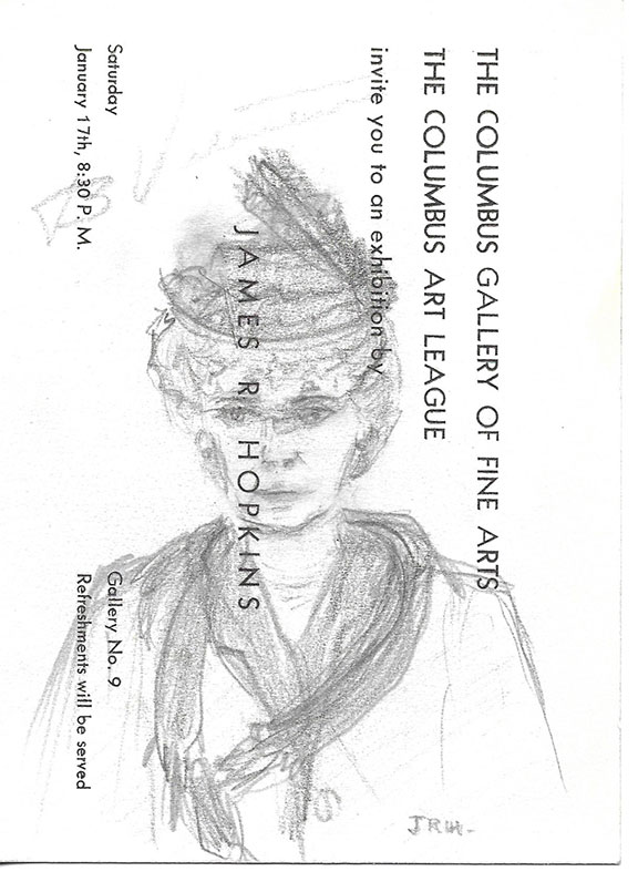 HOPKINS, James R. (1877-1969). Popular American artist known for his figure portraits. Widely exhibited artist in more than a dozen museums. He improved his craft while in Paris and socialized with such great artists as Picasso, Renoir, Monet and Degas. Invitation card from the Columbus Gallery of Fine Arts, addressed to Mrs. Carl H. Valentine, 1901 Tremont Road, Columbus, Ohio. The artist has drawn in pencil a half length pose of Carl Valentine and identified the portrait as “C. Valentine.” On the verso the artist has drawn in pencil, a detailed half length portrait of Mrs. Valentine. He writes her name as “B. Valentine” and has signed the portrait with his initials “J.R.H.” In fine condition................$450.00
