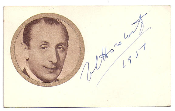 HOROWITZ, Vladimir (1903-1989). Russian-born American concert pianist. Choice signature, dated “1951” on a card which has his small portrait affixed. Excellent for matting and framing.....................................$150.00
