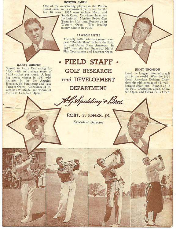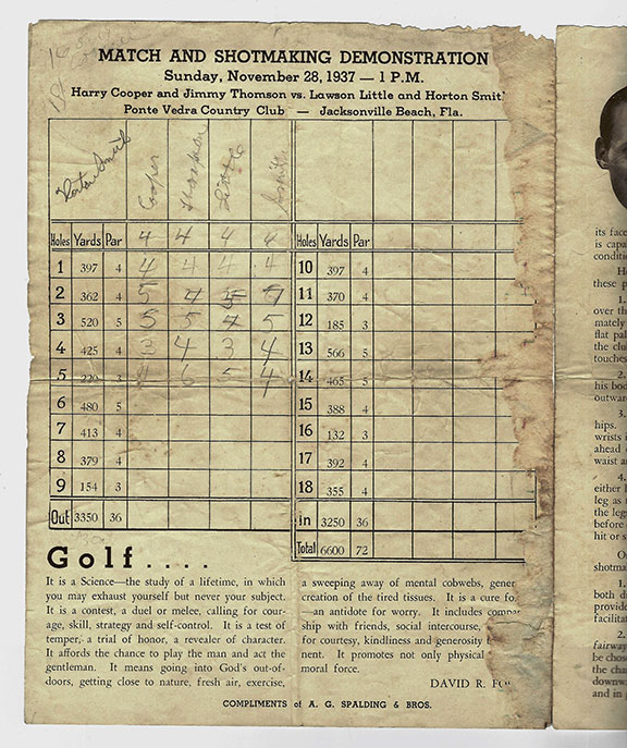 Vintage 1937 Signatures of the Four Best Golf Players in the World. LITTLE, Lawson (1910-1968). Professional golfer, enshrined into the PGA Golf Hall of Fame (1980). Died while only 57 years old. COOPER, Harry (1904-2000). Professional golfer, enshrined into the PGA Golf Hall of Fame (1992). THOMSON, Jimmy (1908-1985). Professional golfer, he was noted as the longest hitter of a golf ball in the world. He won the 1937 North American Driving Championship. Appeared in the movie “The Caddy” with Dean Martin and Jerry Lewis and in “Shoot Yourself With Some Golf” with Ronald Reagan and Jane Wyman. Four page score card printed by A.J. Spalding for a Match & Shotmaking Demonstration to be played by the four of the best golfers in the world dated Sunday, November 28, 1937 at Ponte Vedra Country Club in Jacksonville Beach, Florida. Inside this pamphlet is 1.5 pages of fundamentals signed in print by Robert T. Jones. This contest was played by H. Cooper & J. Thomson vs. Lawson Little and Horton Smith. Page two contains a scorecard listing in pencil the final scores of the four players. Signed in pencil by all four. A very scarce combination of autographs, seldom offered on the market. Signatures of Horton Smith are very scarce and are lacking in many collections of golf autographs............. SOLD ¨¨