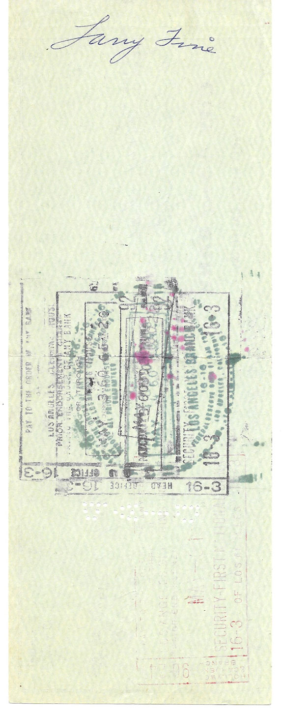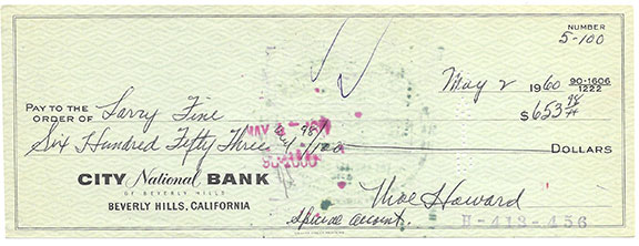 Check on Howards “Special Account” May 2, 1960 on City National Bank, Beverly Hills. Accomplished by Howard’s hand and made payable to Larry Fine for $653.98. Signed “Moe Howard” and on the verso by “Larry Fine.” In fine condition with bank cancellation not touching Howard’s fine signature......................SOLD ![]() |