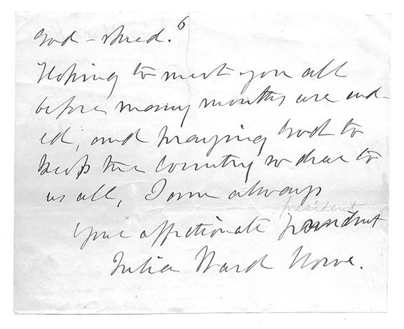 HOWE, Julia Ward (1819-1910). American social reformer. Leader in the woman-suffrage movement. Author of the “Battle Hymn of the Republic” (1862) which was written after she attended a review of Union Troops at Bailey’s Cross Roads outside Washington during which she witnessed a sudden and unexpected attack by the enemy on Nov. 20, 1861. That night she lay in a dark room and wrote line after line and the song was quickly composed. Wonderful portion of an autograph letter signed six lines. one page. Howe writes: “God speed. Hoping to meet you all before many months are ended and praying God to keep the country so dear to us all, I am always, your affectionate president, Julia Ward Howe. A wonderful statement about America and signed with her very desirable full signature. In fine condition......................$350.00