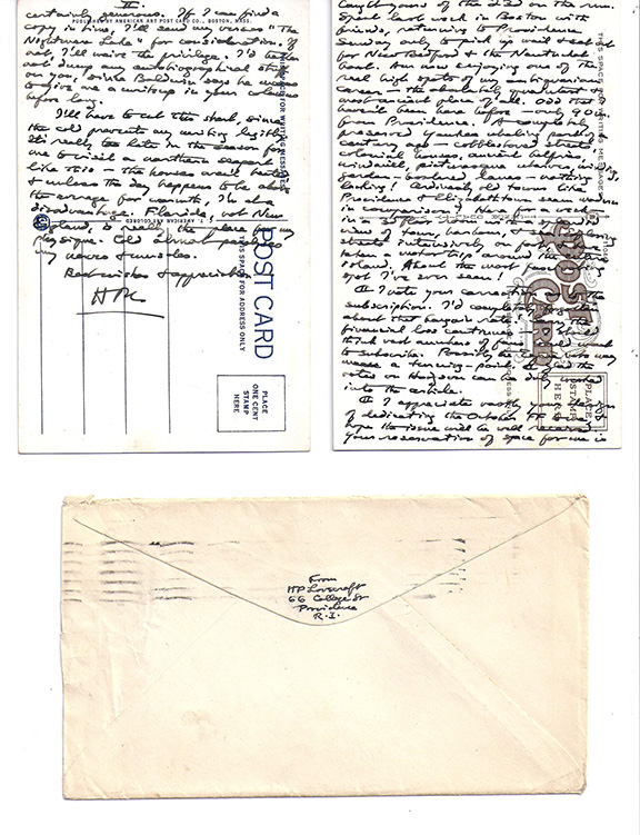 with excellent content LOVECRAFT, H.P. (1890-1937). American writer of weird fiction, second only to Edgar Allen Poe as a literary explorer of the Supernatural. Choice and very lengthy autograph letter signed, one and a half pages on the verso of two color postcards of Nantucket, Mass [no date] but cards were mailed in an envelope, hand addressed by Lovecraft and postmarked Nantucket, Aug. 31, 1934. In part: “..on the run, spent last week in Boston, returning to Providence...only to pick up mail and set out for New Bedford and the Nantucket coast. Am now enjoying one of the real high spots of my antiquarian career...odd that I haven’t been here before only 90 miles from Providence. A superbly preserved Yankee whaling town part of a century ago, cobblestone streets, colonial houses, ancient belfries, picturesque wharves, winding gardens...nothing lacking. Old towns like Providence, Elizabeth Town seem modern in comparison. Here for a week in a third floor room with a splendid view of town, harbour and sea, exploring streets...on foot and have taken a motor trip around the entire island. About the most fascinating spot I’ve ever seen. I note your corrections as to the subscription. I’ve completely forgotten about the bargain rate! Sorry the financial loss continues - I would think fans would want to subscribe...am glad the notes on Hogson can be duly worked into the article...I appreciate vastly your design of dedicating the October FF to me and hope the issue will be well received. Your reservation of space for me is certainly generous. If I can find a copy in time I’ll send my verses “The Nightmare Lake” for consideration. If not I’ll wave the privilege. I’d better not dump any autobiographical stuff on you since Baldwin says he wants to give me a write up in your column before long. I’ll have to cut this short since the cold prevents my writing legibly. It’s really to late in the season for me to visit a northern seaport like this - the houses aren’t heated and unless the day happens to be above average for warmth I’m at a disadvantage. Florida not New England is really the place for my physique. Cold almost paralyzes my nerves and insides.” Signed “H.P.L”. Together with the original envelope hand addressed to “Charles D. Harving, Esq., Elizabeth, N.J.: On the outer flap of the envelope Lovecraft has signed his name and added his return address. In very fine condition ..........................SOLD ![]() |