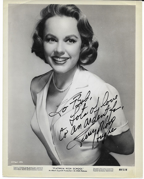 HUGHES, Terry Moore (1929- ). American actress nominated for the Academy Award for best Supporting Actress in “Come Back Little Sheba” (1952). Terry Moore played the part of Venus in three episodes of the 1967 “Batman” TV series. She was married 5 times not including the disputed marriage to Howard Hughes (1949-1976). She is one of the last surviving stars of the Golden Age of Hollywood. Vintage, B&W photo from “Platinum High School” MGM, copyright 1960. Bust pose, smiling, inscribed, and signed: “To Bob, Lots of love to an ardent fan, Terry Moore Hughes.” In particularly good condition................95.00