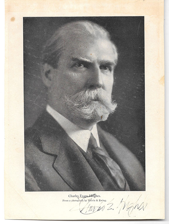 HUGHES, Charles E. (1862-1948). Appointed by President Taft Associate Justice of the U.S. Supreme Court in 1910. Republican presidential nominee (1916). U.S. Secretary of State (1921-1925). Appointed Chief Justice of the U.S. Supreme Court by President Hoover (1930) and he held this position until 1941. Printed portrait from a photograph taken by Harris & Ewing. Bust pose, B&W, looking directly into the camera. Signed on the lower white margin. Not common in signed portraits. A fine example........... $325.00