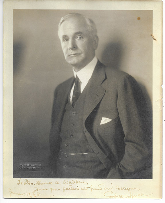 HULL, Cordell (1871-1955). American politician, United States Secretary of State for eleven years. He advised President Roosevelt to reject the S.S. St. Louis, a German ocean liner carrying 936 Jews seeking asylum. Hull’s decision sent the Jews back to Europe on the eve of the Holocaust. It is said that 254 of the passengers were murdered by the Nazi’s. Hull created the Federal Income Tax, he established the United Nations and FDR called him the Father of the U.N. During 1945, he was the recipient of the Nobel Peace Prize. Harris & Ewing photograph, 8”x10”, half-length photo, inscribed, signed, and dated. “To Mrs. Thomas A. Wadden, from your father’s old friend and colleague, Cordell Hull, June 1938.” A small section of the middle right margin a bit rough, otherwise very good....$125.00