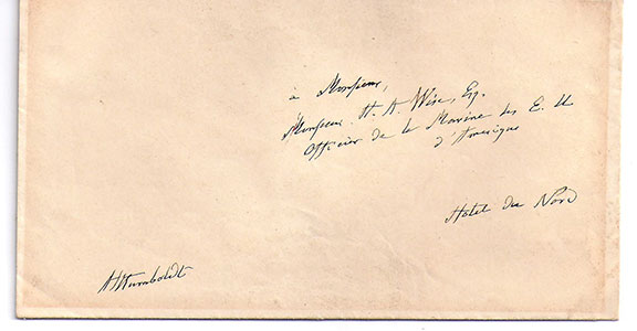 HUMBOLT, Baron Alexander von  (1769-1859).  German scientist; helped found modern geography. He drew the first map using isothermal lines.  Autograph note signed on the front of an envelope.  Introduction of a marine officer, written in French. Fine example............................... SOLD