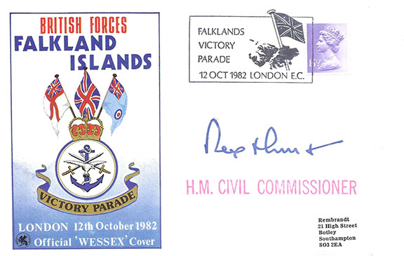 HUNT, Rex (1926-2012). Governor, Commander in Chief and Vice-Admiral of the Falkland Islands. High Commissioner of the British Antarctic Territory. He became a household name after the April 1982 invasion of the Falkland Islands by the Argentine Navy and Army. He was taken prisoner after a brief scuffle. Very attractive and colorful cover commemorating the Falkland Islands Victory Parade. British Queen Elizabeth postage stamp cancelled 12 October 1982 London. Very colorful cachet. Boldly signed “Rex Hunt” as H.M. Civil Commissioner. In very fine condition. Not a common signature..................$67.50
