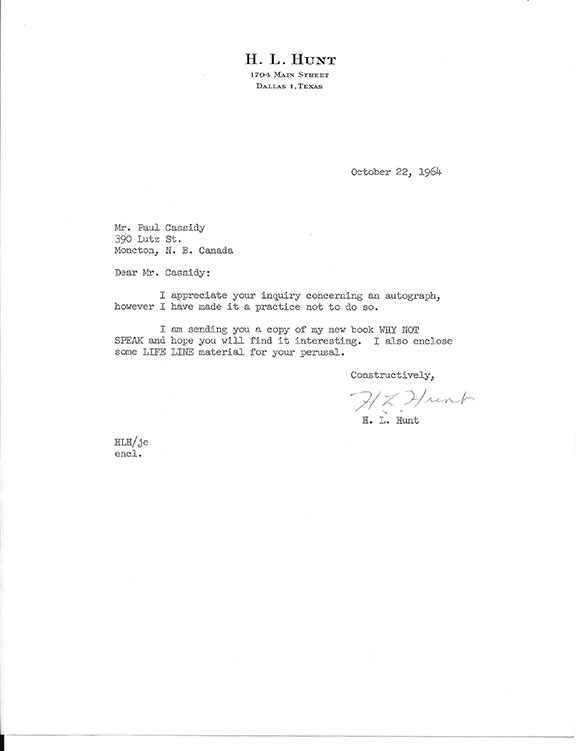HUNT, H.L. (1889-1974). Texas oil tycoon. At the time of his death he was reputed to have the highest net worth in the world. His life was the chief inspiration for the television series “Dallas” and whose famous character J.R. Ewing was based on the popular perception on H.L. Hunt. Typed letter signed on his name imprinted letterhead. October 22, 1964 stating “your inquiry concerning an autograph however I have made it a practice not to do so….” Signed “H. L. Hunt”. Autographs of Hunt are rather scarce in any form. In fine condition............$135.00
