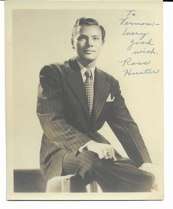 HUNTER, Ross (1921-1995). Actor who went on to producing over 60 films. Known for “Airport” (1970) which won him an Academy Award. “Magnificent Obsession” (1954), “Pillow Talk” (1959), and “Madame X” (1966). Vintage photograph 4”x5”, three-quarter length pose, dressed in a suit and looking directly into the camera. Inscribed “To Vernon-Every good wish, Ross Hunter.” On the verso Hunter as written: “Stop in to see me or write again. R.” In fine condition................................$75.00