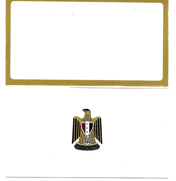 Saddam became President of Iraq on July 16, 1979. On Jully 22 1979, he convened as assembly to read out a confession of the names of 68 co-conspirators. Those members were then removed from the room and taken into custody. They were found guilty of treason. Twenty-two were sentenced to execution and other high ranking members of the party formed a firing squad. By August 1, hundreds of party members were executed. Folding gift/note card, measures 2.25”x4.25” with the colorful emblem/Coat of Arms of Iraq. It features the Eagle of Saladin, a gold and black eagle looking to the left. It bears a shield of the Iraq flag, holding a scroll with the Arabic words translated “Republic of Iraq.” On the third panel in Kufic Script, Saddam Hussein has written in bold red ink to his secretary to give 2000 Dinars and a Saloon Car to Shibli Al-Aysami and signed and dated 14/08/1984. The armed conflict between Iran and Iraq ran from September 1980 thru August 1988. In 1984, France decided to supply aircraft which enabled Baghdad to intensify its operation against Iranian oil facilities. Aysami was Vice-President of Syria from Dec. 28,1965 to 23 February 1966. In 1966 he fled to Iraq. He became Deputy Secretary General of the National Command of the Iraq based Ba’ath Party. On June 4, 2011 he was kidnapped by unknown militants and is presumed dead. Card is in fine condition..................$1695.00 ![]() ![]() |
