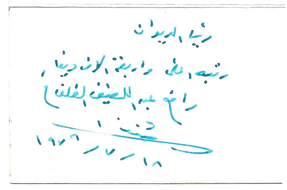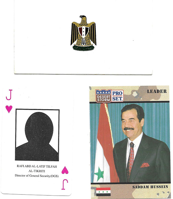 Saddam became President of Iraq on July 16, 1979. On Jully 22 1979, he convened as assembly to read out a confession of the names of 68 co-conspirators. Those members were then removed from the room and taken into custody. They were found guilty of treason. Twenty-two were sentenced to execution and other high-ranking members of the party formed a firing squad. By August 1, hundreds of party members were executed. Folding gift/note card, measures 2.25”x4.25” with the colorful emblem/Coat of Arms of Iraq. It features the Eagle of Saladin, a gold and black eagle looking to the left. It bears a shield of the Iraq flag, holding a scroll with the Arabic words translated “Republic of Iraq.” On the third panel in Kufic Script, Saddam Hussein has written in bold blue ink, translated: To his Chief of Staff to give a rank and 4000 Dinars to Rafi Abd Latif 18/07/1979. Rafi Abd Latif Tifah al-Tikriti was the head of the General Security Secret Police Force and cousin to Saddam. Together with a Desert Storm Saddam Hussein collectors’ card and a Jack of Hearts card for Rafi Abd al-Latif Tifah al-Tikriti from the United States deck of the most-wanted Iraqi playing cards during the war. There are 52 playing cards in the set and he is one of six that have not been caught. All items in fine condition, gift card seems to have a fingerprint bottom and top left, possibly Saddam’s print (leap of faith) one of the new words added to the autograph collectors glossary..................................$1695.00 ![]() ![]() |