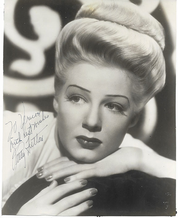 HUTTON, Betty (1921-2007) American actress and singer during the 1940’s. Photograph 7.5”x9.25”, head and shoulders pose, full face looking quite serious. Inscribed and signed: “To Vernon with best wishes Betty Hutton.” In V/G-Fine condition with minor remnants of prior mounting on verso.....................$145.00![]() |
