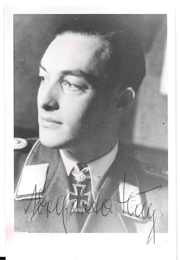 HUY, Major Wolf-Dietrich (1917-2003). German fighter pilot. Ace credited with 40 victories. He caused much damage to the British Fleet in the Mediterranean. His bombing helped secure the Island of Crete for Germany. Shot down over North South Africa and survived the crash. He became a P.O.W. Photograph, 4”x6”, B&W, head and shoulders pose in uniform. Signed in full........... $67.50 |