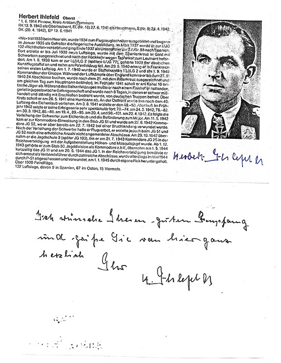 IHLEFELD, Oberst Herbert (1914-1995). German fighter pilot during WWII. Flew with the JG-1-11-52-77. Ace credited with 130 victories and flying over 1,000 missions. He fought in the Spanish Civil War as well and credited with 7 victories. He became the fifth fighter pilot to score 100 victories. He helped form the Jagdwaffe. He was awarded the Knight’s Cross with Oak Leaves and Swords. Biography which incorporates a 2.5”x3.5” portrait of Ihlefeld, head & shoulders pose in uniform. Signed below his portrait. On the verso he writes a three line sentiment and signed once again. Fine condition............$85.00