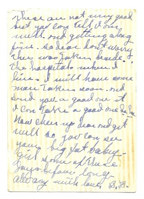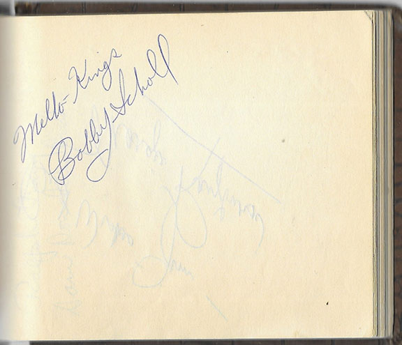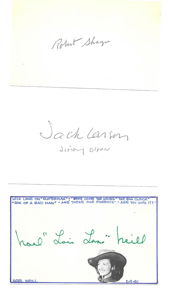 Card measuring 3”x5” displaying facial portraits of the Five Stooges and Officer Joe Bolton. Four of the five Stooges have signed their first name by their portrait. Joe Besser has signed with his full name. On a larger portrait of Officer Joe Bolton, he has signed his name in full during old age. Very light discoloration above Joe Besser’s signature and possibly a fingerprint over the signature “Curly.” Otherwise in V/G condition. Of utmost desirability $2750.00
