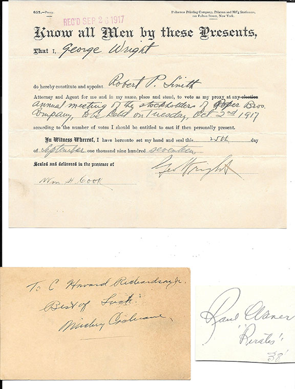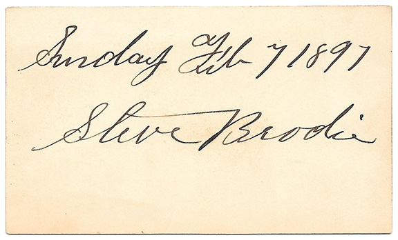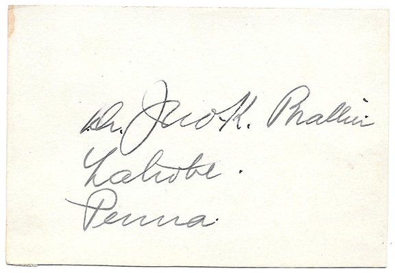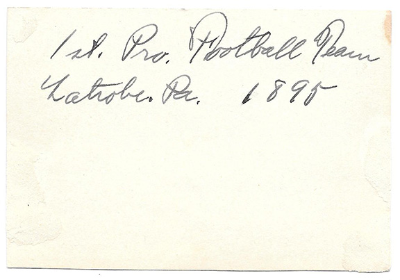 EXTREMELY RARE, full signature on a card, “Dr. Jno K. Brallier” adding “Latrobe, Penna” in his hand.. On the verso he has written: “1st Pro. Football team Latrobe, PA. 1895”.