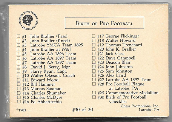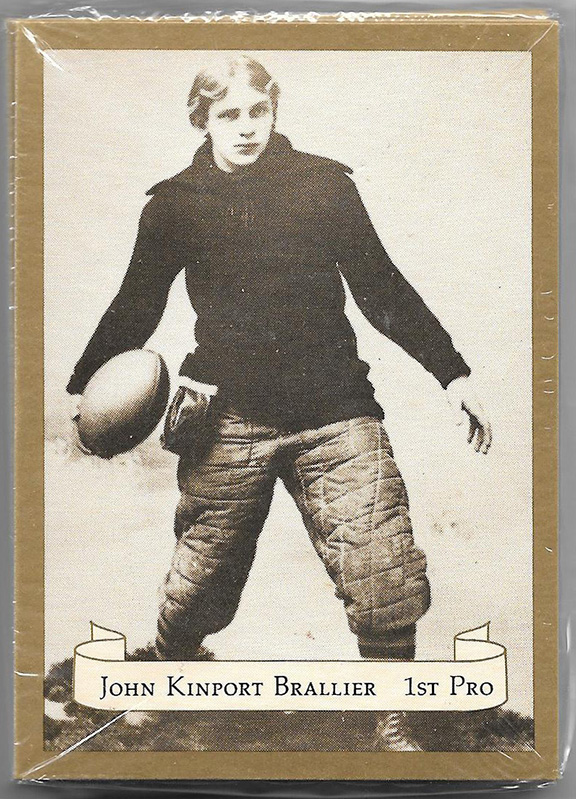 Together with a portrait of john Brallier and a sealed set of “Birth of Pro Football” cards. This is a thirty card set, printed in 1983. John Brallier is on card #1,2,3,4,, possibly on card 5, 6, and 7 and also on card twenty.