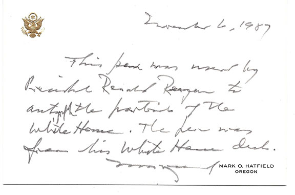 Superb Color Photograph Signed by 4 U.S. Presidents, smiling, appx. 8”x10”, depicting the four – Nixon, Carter, Ford, and - Reagan standing together before an American flag. This historic and formal photograph was taken at The White House when the four met there before Nixon, Carter, and Ford (as Reagan’s representatives) departed for Egypt to attend Egyptian President Anwar el-Sadat’s funeral following his assassination (October 6,1981). A superb photograph, and a rare assemblage of signatures on a color photograph. This is one of the rare full sized 8”x10” photographs and not the ones that have a 5”x71/4” image on an 8”x10” photograph. Boldly signed on the image: “Richard Nixon”, “J. Carter’’, ‘Gerald R. Ford”, and “Ronald Reagan” and he adds the date “11/6/87” in his hand (as President). Reagan’s signature was obtained “in person” by Senator Mark O. Hatfield of Oregon, as a favor for Stephen Koschal. This is one of two known examples positively signed as president. In MINT condition