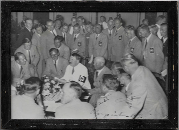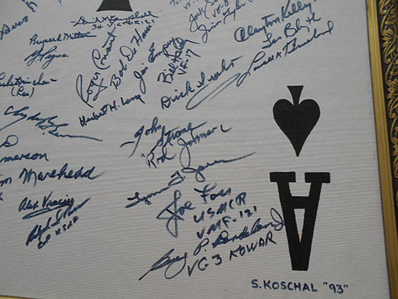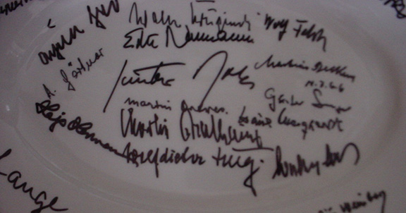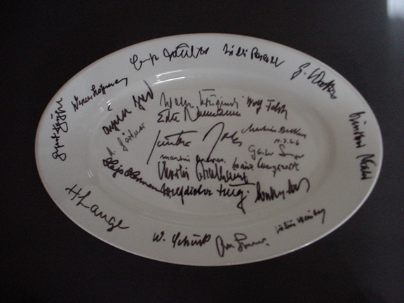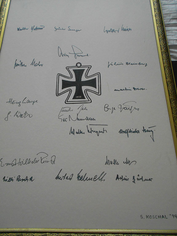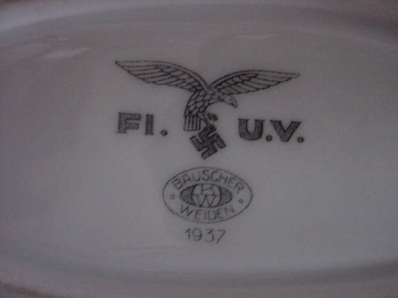LUFTWAFFE ACES. An Ace is a fighter pilot who has shot down 5 or more enemy planes. Large porcelain Luftwaffe serving platter. Produced by Bauscher, Weiden with their mark/seal on the verso, dated 1937. The German Eagle over a Swastika is above the maker’s mark. Hand signed by 24 German Aces with a total of over 1, 278 victories. All autographs on this platter were obtained in person by Stephen Koschal during the mid 1990's. The autographs were obtained at the Luftwaffe reunions in Rudesheim, Germany. Photograph of Steve Koschal with Adolf Galland the day he signed this platter. All those signing were quite happy to sign and many were excited to see the verso of this platter. According to Gerhard Schoepfel this platter brought back many memories and he asked to have his picture taken with the platter. Those who have signed this platter are: