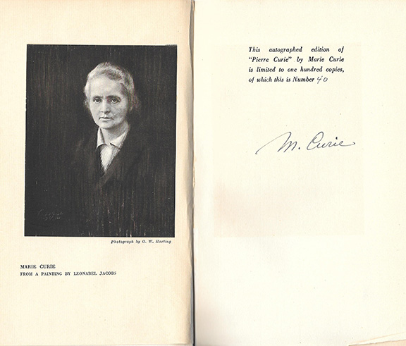 Her biography of her distinguished husband: Pierre Curie. Translated by Charlotte and Vernon Kellogg. Blue boards, cloth back, New York, 1923, First U.S. Edition. Limited to ONLY 100 numbered copies, signed. This copy being number 40.