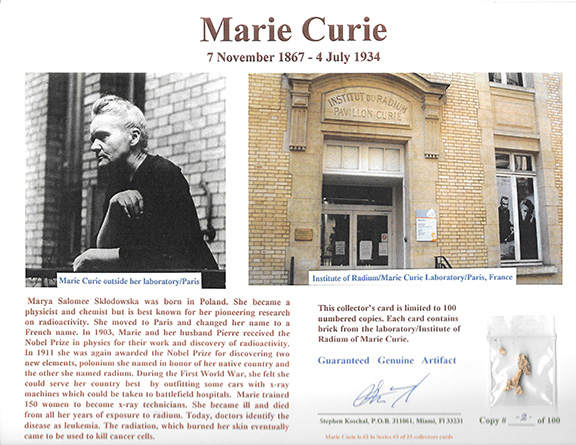 Also included in this collection is a limited edition card, printed in color, 8.5”x11”. A picture of Marie Curie standing outside her Institute of Radium and a color illustration of the front of the Institute in Paris. A nice printed biography of Marie Curie is printed on the card. These cards were printed in a limited edition of 100 numbered copies hand signed by Stephen Koschal the creator. Each card contains pieces of brick from the Laboratory/Institute of Radium. A very attractive card for framing. The collection $5,500.00
