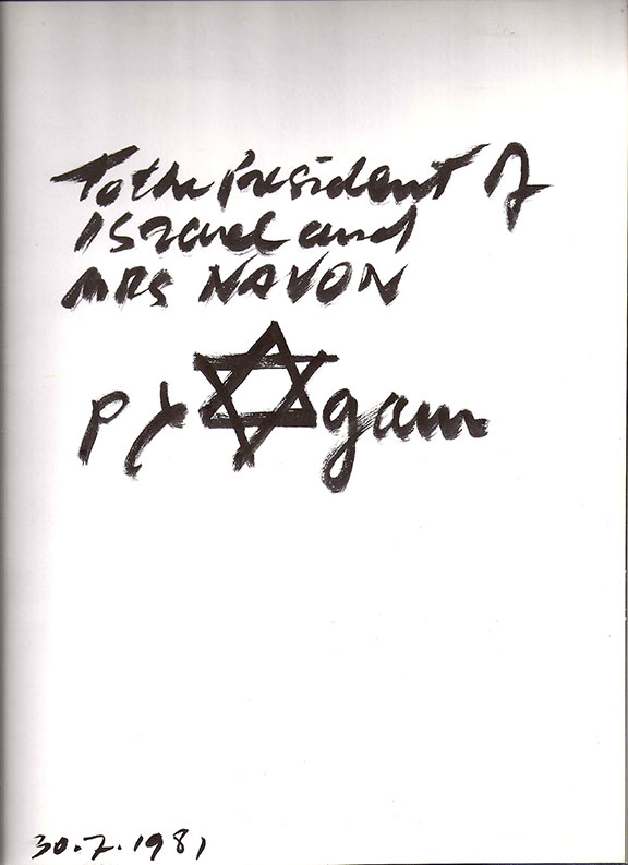 Agam’s book: Hommage To Agam - Xxe Siecle, 1980, Printed in France in French. Plates captions both in French and English. Book also contains two original color lithographs by Agam. 159 pages, heavily illustrated. Hardcover. Very boldly inscribed to the 5th President of Israel. “To the President of Israel and Mrs. Navon, Agam, 30.7.1981”. Agam has artistically drawn the Star of David which is incorporated in his initial “A” in Agam. Most unusual and a choice association item between the great Israeli artist and the President of Israel. Certainly one of a kind. $395.