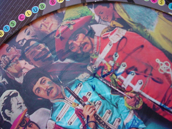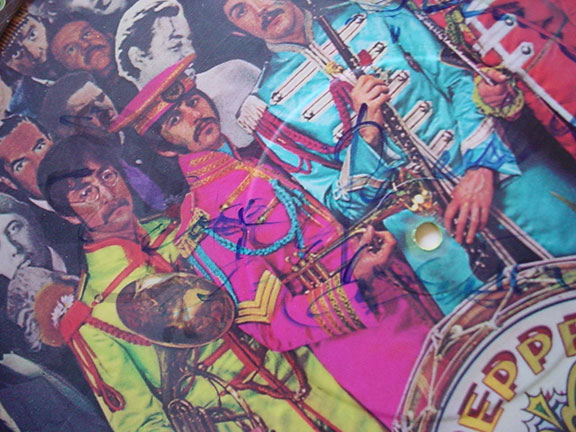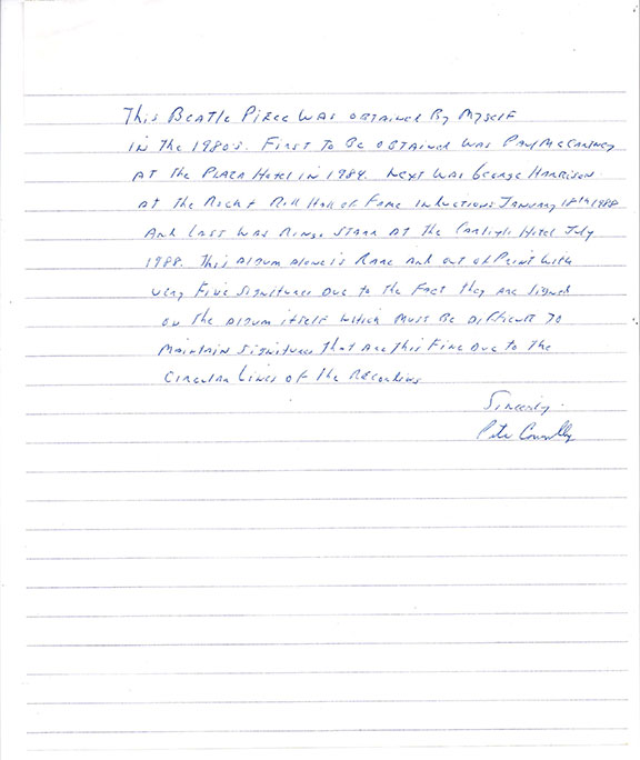 THE BEATLES. George Harrison, Paul McCartney and Ringo Starr. Their fantastic and colorful album “Sgt. Peppers Lonely Hearts Club Band.” Capitol Records, 1978. Hand signed by Harrison, McCartney and Starr on the record. Record comes complete with the record cover. Album in excellent condition, cover shows light wear. Together with a one page handwritten letter of provenance from long time and well known “in person” collector Pete Connolly. Pete writes about obtaining each autograph, the place and date each signature was obtained. We purchased this album in the mid-90’s directly from Pete Connolly. A modern rarity $4,950.00
