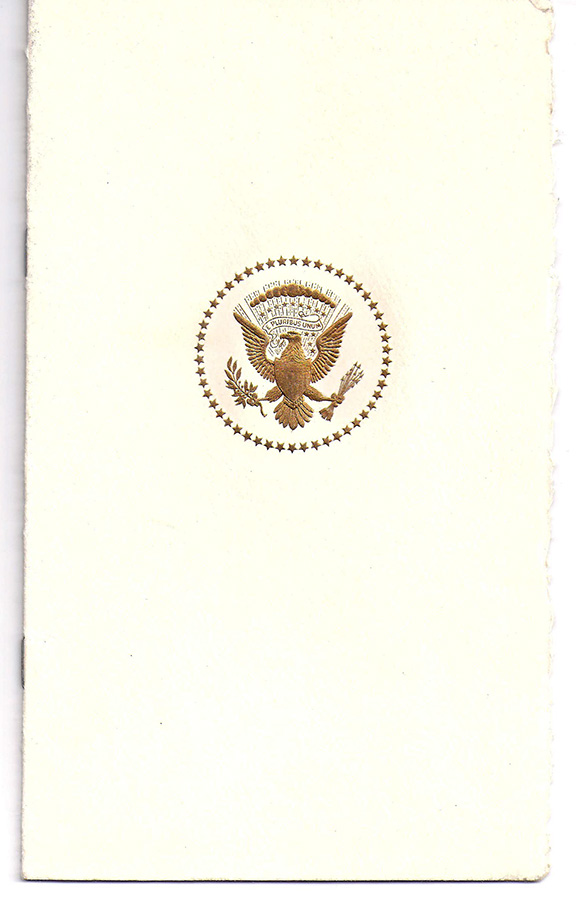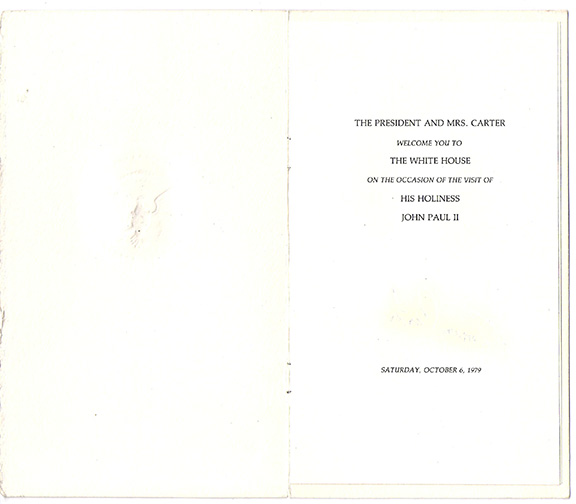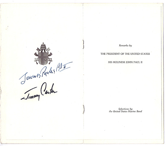 Booklet/program with a large gold embossed seal of The President of the United States on the front cover. The title page states: “The President and Mrs. Carter Welcome You To The White House On The Occasion Of The Visit Of His Holiness John Paul II”. Saturday, October 6, 1979. Turn the page and it is hand signed by Joannes Paulus PPII and a full signature of Jimmy Carter.