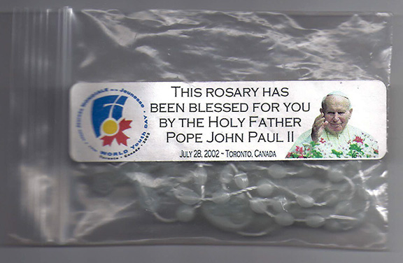 Together with Rosary Beads, that appear to glow in the dark. Contained in a packet labeled “This Rosary Has been Blessed For You By The Holy Father Pope John Paul II, July 28, 2002 - Toronto, Canada”. There is a picture of Pope John Paul with his hand raised as in a blessing. Created for “World Youth Day, Toronto, Canada, 2002”. In excellent condition. SOLD