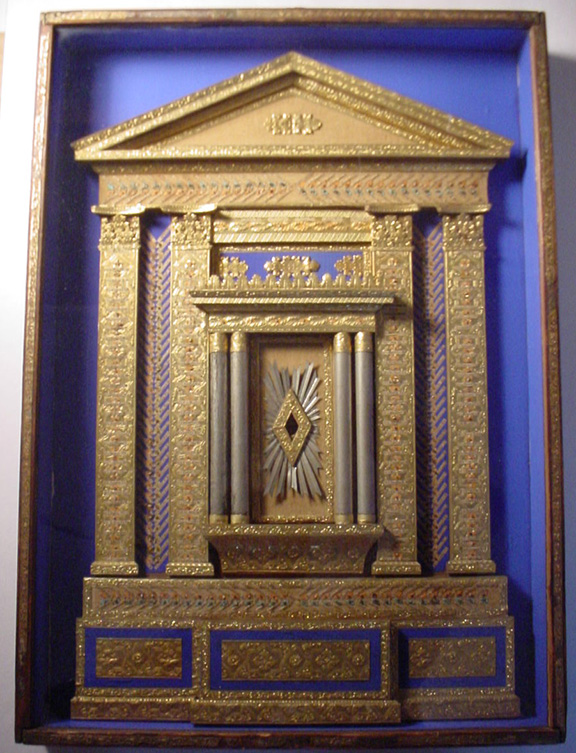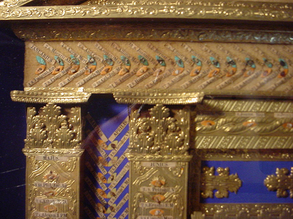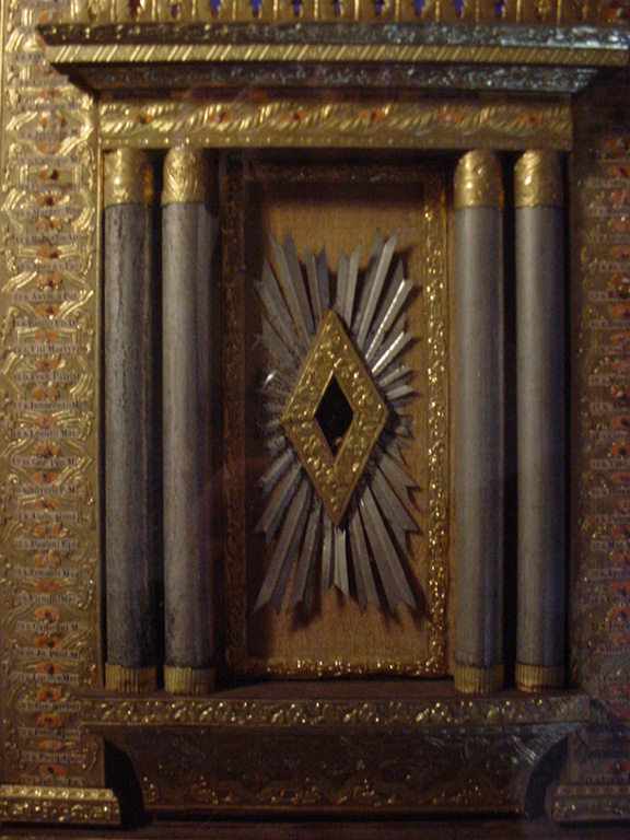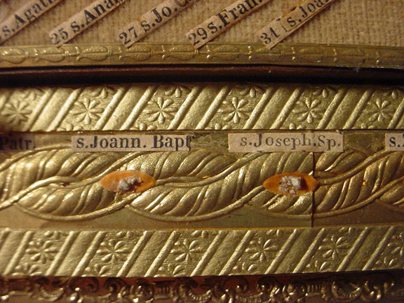 This extremely ornate reliquary is enclosed in a shadow box and measures approximately 20”x14.5”x2”. It takes the shape of an alter of eight columns with a Greek styled roof. The columns, roof and base are lined in a gold foil. This reliquary contains actual pieces of bones, first class relics across the top and on top of the columns and in between the columns. Each bone is identified on a small slip. At the top left, just below the roof starts the relics for the months of January and February. There is a relic for each day of the month. The first column on the left is for the month of March. Thirty one relics, one for each day of the month are attached. All the additional months follow to the right and across the bottom of the alter. This reliquary contains a total of 377 relics each identified by name and day and month of the year. In the very center of this reliquary is a sliver of wood in the shape of a cross. This wood is what the Vatican believes is from the true cross that Christ was crucified. At one time during the 1970’s this reliquary was shown to Monseigneur Mulligan from St. Henry’s Cathedral in Bayonne, New Jersey. Upon seeing this reliquary, the Monseigneur got down on his knees and wept.