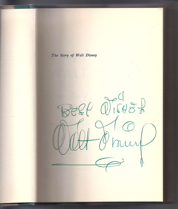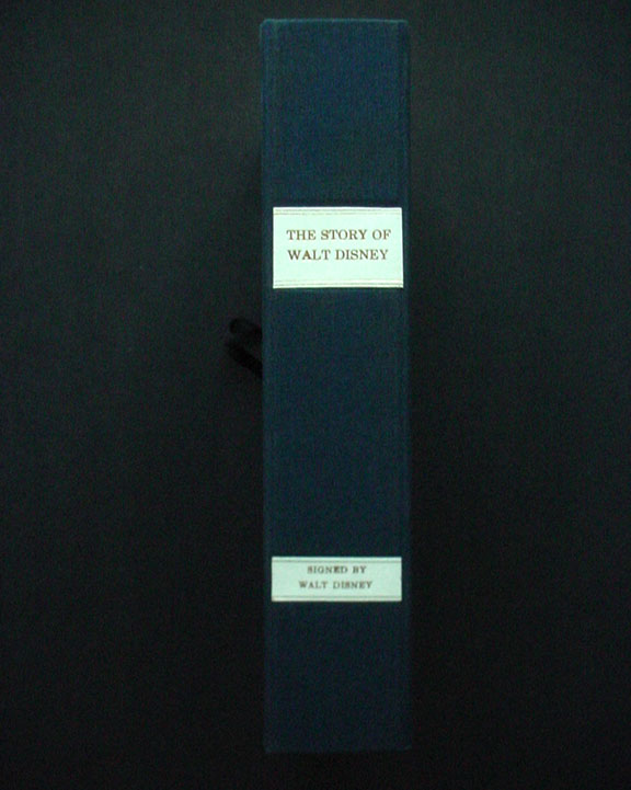 DISNEY, Walt (1901-1966). American cartoon artist, producer of animated films and film studio founder. The Story of Walt Disney by Diane Disney Miller. Henry Holt & Co. 1957, First Edition. Hardcover with dust jacket. Beautifully signed on the half title page, "Best wishes, Walt Disney." In fine condition, a bright clean copy, with light wear to the dust jacket. Bookplate affixed to inside the front cover with the written name "Jerry Lewis." The signature of Walt Disney is exceptionally large. Contained in a custom made protective box. SOLD