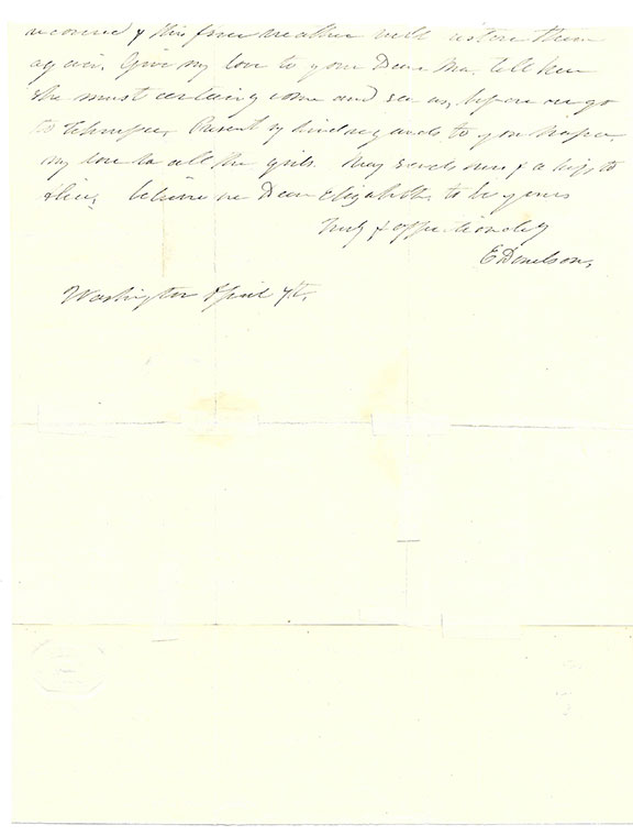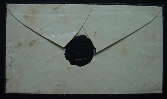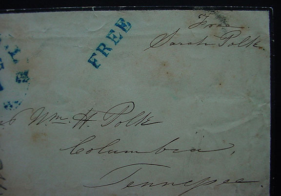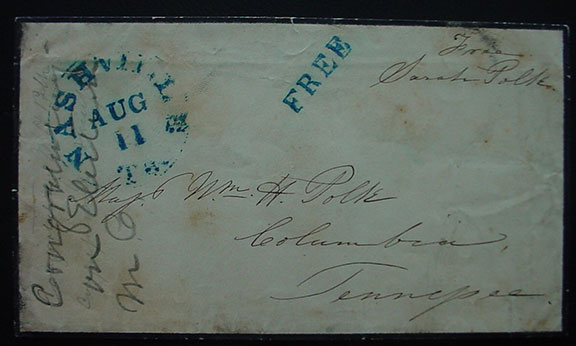 POLK, Sarah (1803-1891). First Lady, widow of President James K. Polk. Free frank signature “Free Sarah Polk”, on a mourning envelope addressed in her hand to Maj. Wm. H. Polk, Columbia, Tennessee. A dark ink hand stamp at left corner “Nashville, TN, Aug.11” and “Free” handstamp. Intact black wax seal on verso. Collector’s note along front left corner of the cover.