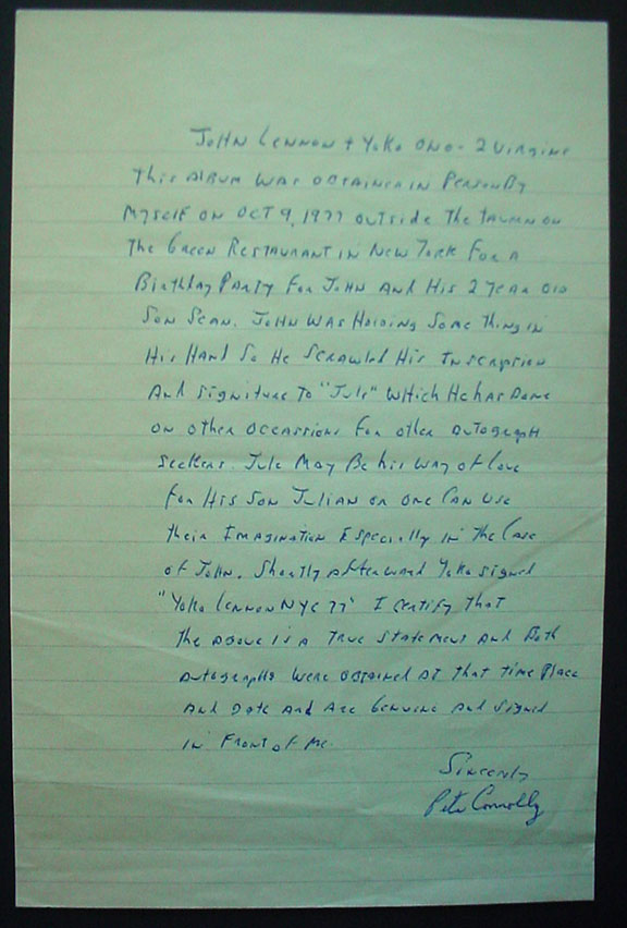 LENNON, John (1940-1980) and Yoko Ono(1933- ) Their album Two Virgins. Apple Records, May 1968. The record is contained in the RARE album cover. Boldly inscribed by John Lennon on the album cover, the side which depicts him and Yoko Ono in full frontal nudity. Lennon writes: “To Jule love John Lennon”. Yoko has added, using the same collector’s pen: “and Yoko Ono NYC 77”. Also present is the album cover jacket which was issued to cover the nude photos of this famous couple. This highly prized collectible comes with a full page handwritten letter of authenticity from one of the most noted “in person” collectors of musical autographs. His name is Pete Connolly of New York. Pete, is one of the original “in person” collectors who is very well known in the hobby amongst his peers. He is the collector who supplied many of the legitimate galleries with guitars and other musical instruments signed by many of the rock and roll notables. Many of the Stars know Pete by his first name. Pete’s handwritten letter of authentication and original envelope comes together with this album. Pete writes: “John Lennon & Yoko Ono-2 Virgins. This album was obtained in person by myself on Oct. 9, 1977 outside The Tavern On The Green Restaurant in New York for a birthday party for John and his 2 year old son Sean. John was holding something in his hand so he scrawled his inscription and signature ‘To Jule’ which he has done on other occasions for other autograph seekers. Jule may be his way of love for his son Julian or one can use their imagination especially in the case of John. Shortly afterwards Yoko signed: “Yoko Lennon NYC 77”. I certify that the above is a true statement and both autographs were obtained at that time, place and date and are genuine and signed in front of me. Sincerely, Pete Connolly.” The record and album cover are in fine condition. The album jacket shows a little wear. A remarkable collectible. $9,500.00