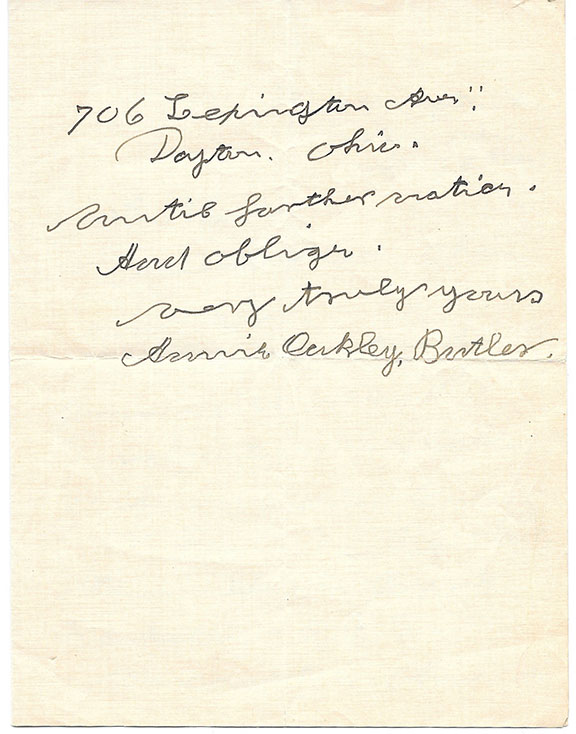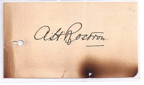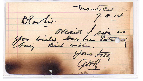 Autograph letter signed, one side and signed once again on the verso. Piece of lined paper measuring appx. 3”x6”: “Montreal, 7/8/14, Dear Sir, Overside, I sign as you wished. Have been extra busy. Best Wished, Yours truly, A.H.R.” On the verso Rostron has signed with the finest full signature one can imagine. For those who would think of it, the page could be trimmed so that one could end up with the closing of the letter signed with initials from one side and the other with a full signature. The letter has one punch hole barely touching the word “extra” and some burn marks from a fire not touching any of the writing. Together with this letter is a Underwood & Underwood magazine photo of Captain Rostron and also several original newspaper articles regarding the Titanic sinking and about a painting sold by Frank Millet who was lost on the Titanic. This letter of Rostron is extremely rare and may be the only letter ever offered containing two signatures $2,950.00