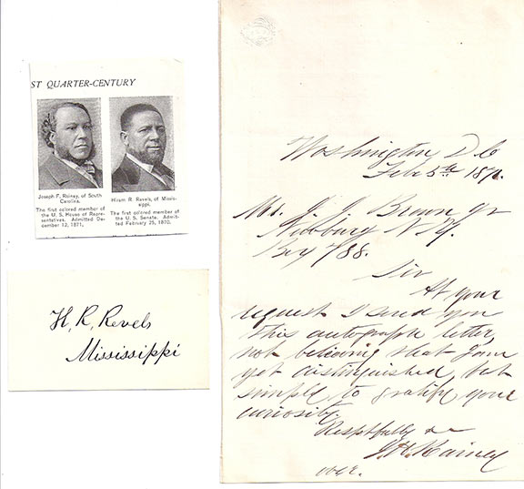 REVELS, H(IRAM) R. (1822-1901). First colored U.S. Senator, elected in 1870 in Mississippi. Popular Minister in the North. Organized the first colored regiment in Maryland and Missouri. He accompanied the Missouri Regiment as a Chaplin to Vicksburg. Choice signature: “H.R. Revels, Mississippi.”.