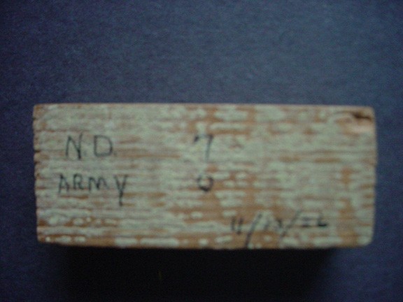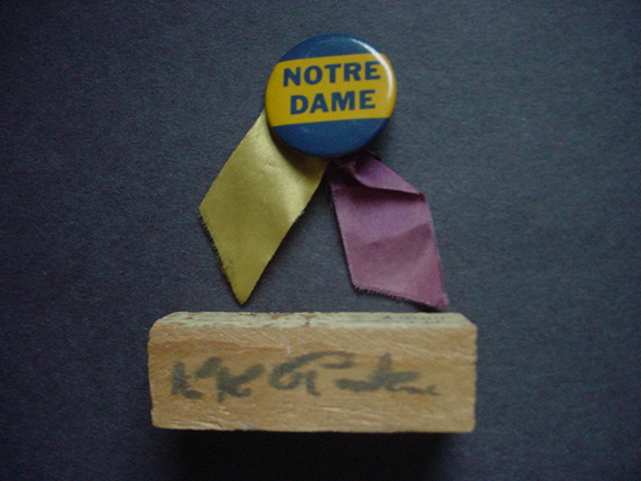 ROCKNE, Knute K. (1888-1931). American football player and coach at the University of Notre Dame. Regarded as one of the greatest coaches in college football history. Inducted into the College Football Hall of Fame. Original piece of the goal post from the Nov.13, 1926 Notre Dame/Army game played at Yankee stadium. In this game, the Fighting Irish handed the cadets their first defeat. Autographed by Knute K. Rockne. On the other side of the piece of goal post is written “N.D. 7 - Army 0, 11/13/26.” Wood measures appx: 1”x3”. Together with a handwritten letter from the woman who I purchased this relic. The original envelope is enclosed postmarked 8 April 1994. She writes in part: “This is an authentic autograph of football coach Knute Rockne on a piece of the goal post from the Notre Dame/Navy game as indicated. These little mementoes were given to each girl attending the Victory Dance over Navy. As I was dating one of the players at that time, I had been to the dance and had the privilege of meeting the great Knute Rockne. He was truly a wonderful person…” Included is the original Notre Dame button Mrs. Burns wore to the game. After I received the letter from Mrs. Burns, I called her on the phone and asked her why she wrote “Navy” instead of “Army.” Her explanation was that game was almost 70 years ago and she just mis-wrote the team. This signed goal post is one of only two we had from that game. Her girl friend also sold us one at the same time. That one we sold years ago. This one has remained in my personal collection since 1994. $3,900.00
