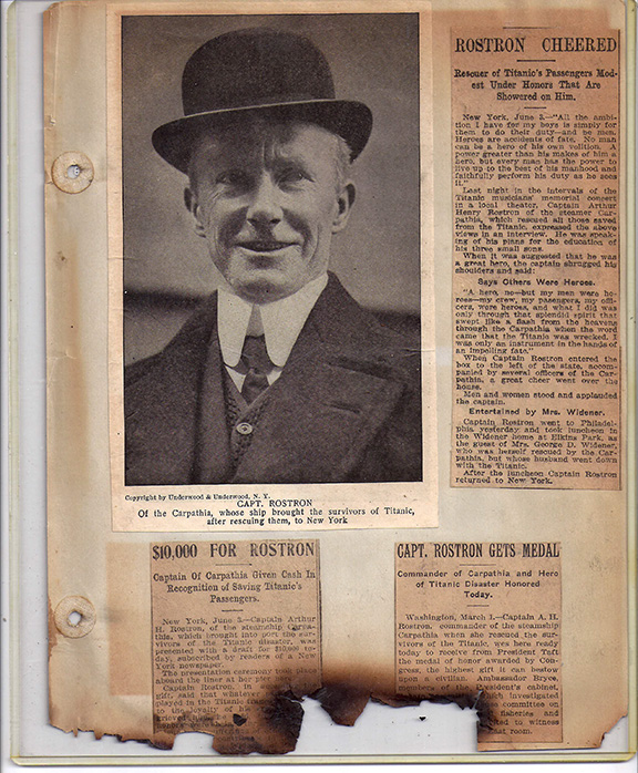 ROSTRON, Arthur Henry (1869- ?). Captain of the Carpathia, who received the Titanic’s distress signal on the night of April 14, 1912. Although he was 60 miles away, he immediately set course for the Titanic braving dangerous ice fields and running the risk of damaging or even sinking his own ship. The result was he saved the lives of over 700 persons. Readers of the New York Times gave him an award of $10,000.00 and he was showered with honors/ He was awarded the Medal of Honor by Congress and it was presented to him by President Taft. During 1914 he took command of the Lusitania and in 1926 was created a Knight Commander of the Order of the British Empire. In 1931 he wrote his life story Home From The Sea.