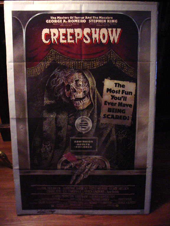 KING, Stephen (1947- ) American author of contemporary horror, suspense, science fiction and fantasy. His books sold more than 350 million copies. He published 55 novels and written almost 200 short stories. He is the winner of numerous awards. CREEPSHOW was based on a short-story work which includes five tales of horror inspired by the series of E.C. Comics in the 1950’s. CREEPSHOW is a 1982 horror anthology where Stephen King not only wrote the original screenplay but also starred in the movie.Original movie poster for CREEPSHOW measures appx. 27”x42”, printed in color. Very boldly signed by Stephen King along the bottom white margin. In nearly fine condition except for one small tear on left margin, barely worth mentioning. A magnificent item for framing. $1,500.00