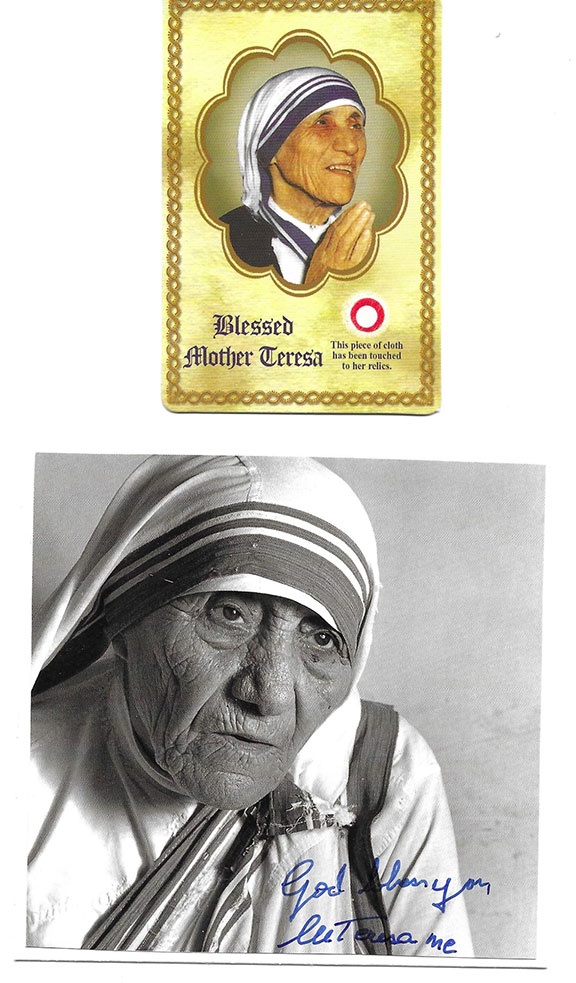 MOTHER TERESA (1910-1997). Albanian-Indian Roman Catholic nun and missionary, known as Saint Teresa of Calcutta. In 1950 she founded the Missionaries of Charity. She was awarded the Nobel Peace Prize (1979) and in 1985 she was presented the Presidential Medal of Freedom from Ronald Reagan. She was closely associated with Pope John Paul II. Pope Francis recognized a second miracle attributed to Mother Teresa. She was canonized on December 17, 2015. A rare color photograph, possibly one of a kind of the Dalai Lama and Mother Teresa, closeup, holding hands and smiling. Signed “God Bless You M. Teresa mc and signed by the Dalai Lama adding a sentiment in his hand. Notation on verso states this photo was signed by Mother Teresa during May 1997 very shortly before her passing. This is the first signed photo of the two we have seen. In fine condition. Can easily be considered a museum piece.