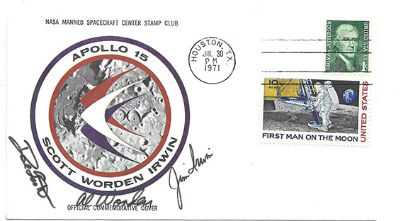 IRWIN, Jim, Al Worden, and Dave Scott. American NASA Astronauts. Apollo XV crew signed cover. Official colorful NASA cachet. Affixed are two US postage stamps, one being First Man on the Moon. Cancelled Houston, TX 7/30/71. Hand signed by all three astronauts. A very attractive cover.................$235.00 |