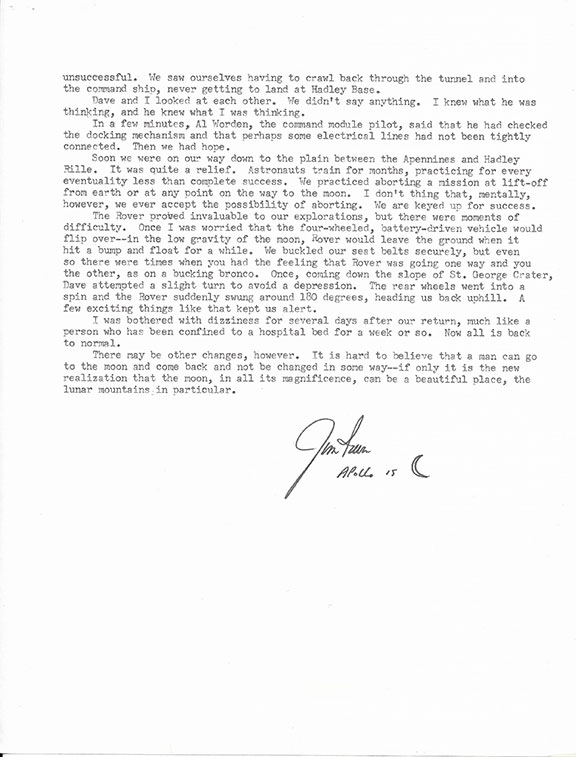 IRWIN, Jim (1930-1991). American astronaut, test pilot. Served as Apollo Lunar Module pilot for Apollo 15. He was the eighth person to walk on the moon and the first and youngest of the moonwalkers to die. Rare typescript, 2 pages “I Will Lift Up Mine Eyes.” A wonderful read regarding his trip to the moon and what he experienced on the moon. One of the nicest signatures of Irwin we have seen, adding in his hand “Apollo 15” and drawing a quarter moon. A fabulous item in very fine condition......................$225.00