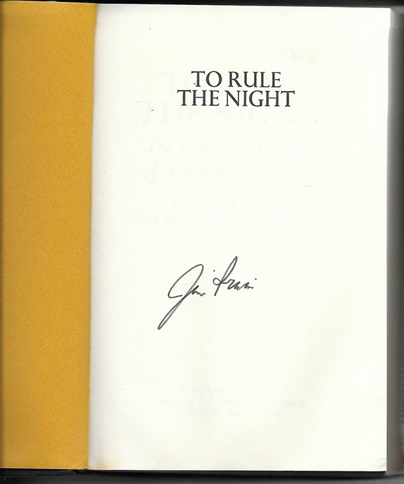 IRWIN, Jim (1930-1991). American astronaut, test pilot. Served as Apollo Lunar Module pilot for Apollo 15. He was the eighth person to walk on the moon and the first and youngest of the moonwalkers to die. His book To Rule the Night, The Discovery Voyage of Astronaut Jim Irwin. A.J. Holman Co. 1973, First Edition so stated. Two hundred sixty-eight pages with illustrations. Near fine copy with dust jacket. Boldly signed with an extra-large signature on the half title page....$165.00 |
