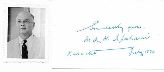ISPAHANI, Mirza A. H. (1898-1986) Patriarch of the Ispahani family in Pakistan. In 1946, he founded Orient Airways. In 1955 it merged with the airline of the Pakistan Government and became Pakistan International Airways Corp. In 1960 he founded the Ispahani Islamic Eye Institute and Hospital. He also founded the Ispahani Public School and College. He was the first exporter of tea from Bangladesh. A fine card 3.5”x5.5” where he has signed his signature in green ink adding: “Sincerely yours, Karachi (Pakistan) July, 1970.” A very desirable and scarce aviation related autograph. In excellent condition... Together with an original brownie type black and white photo, head and shoulders pose. The two.........................................$67.50